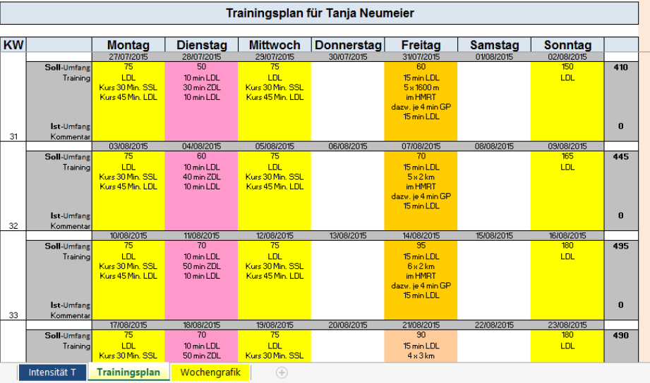 Egal ob Sie sich vom Nichtläufer zum Freizeitläufer hocharbeiten wollen, oder für Ihren ersten Marathon trainieren, gerne erstelle ich Ihnen einen auf Ihre Ziele zugeschnittenen Trainingsplan, der selbstverständlich individuell an Ihre vorhandene Vorgaben wie Zeit, Umfang, und derzeitigen Trainingsstand zugeschnitten wird. Unten sehen Sie ein Beispiel für so einen Trainingsplan, bei Interesse kontaktieren Sie mich bitte direkt unter Diese E-Mail-Adresse ist vor Spambots geschützt! Zur Anzeige muss JavaScript eingeschaltet sein!, ich freue mich auf Ihre Anfrage!